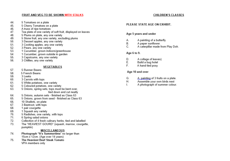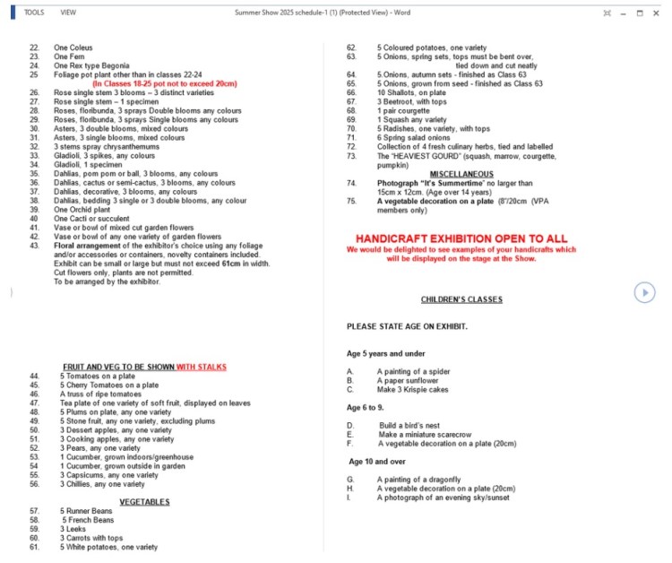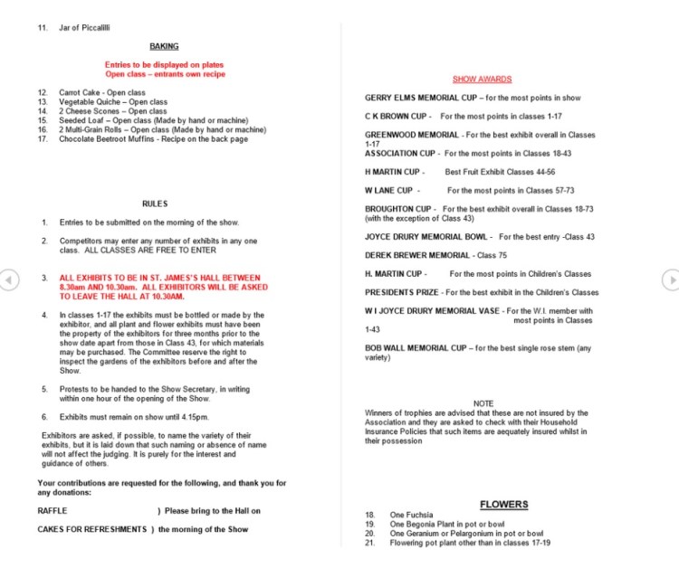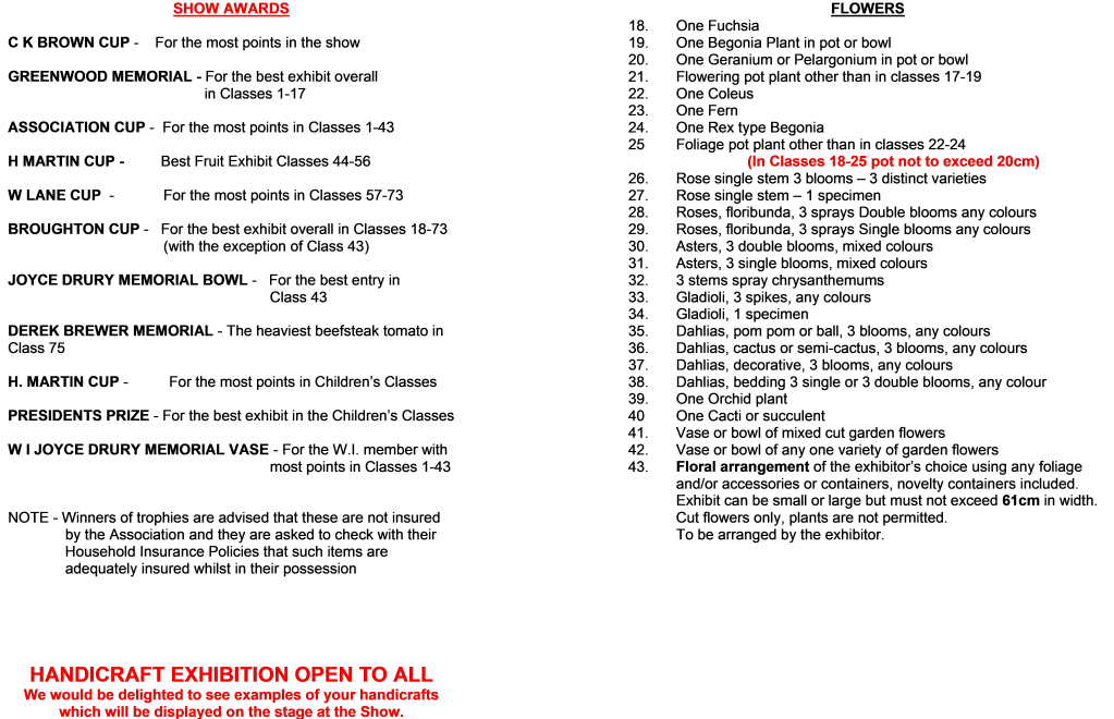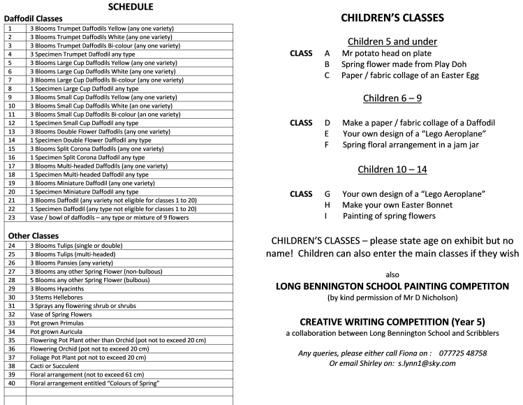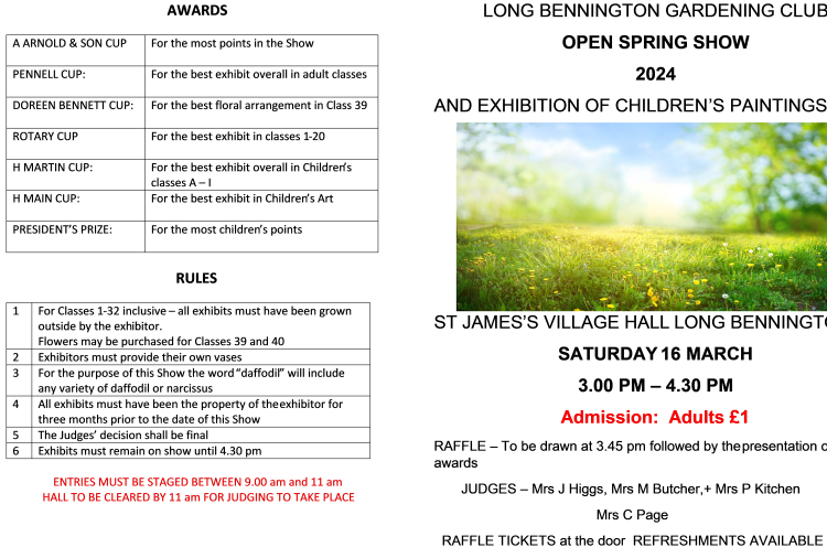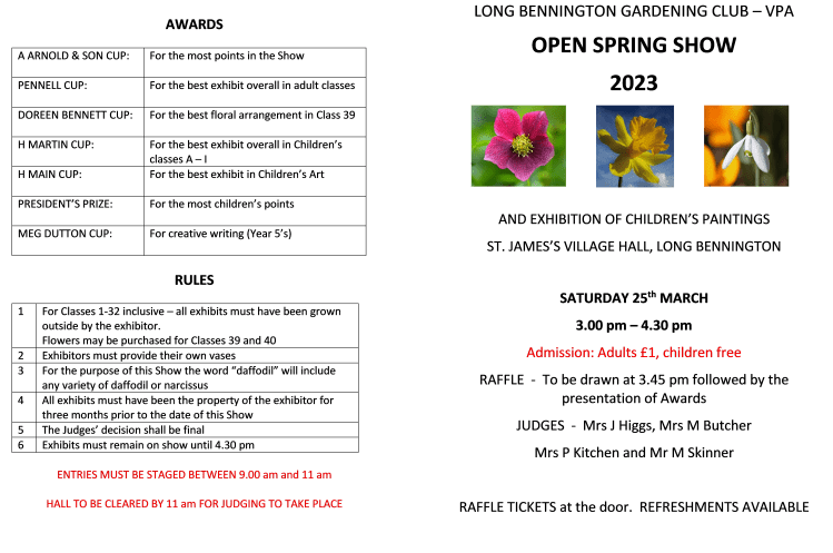 Spring Show – St James’s Hall Sat 25th. The show is a celebration of the beginning of the gardening year and is free for all to enter. Doors open at 9am for entries to be staged by anyone who would like to have a go! There are lots of classes to enter including spring flowers, pot plants and flower arrangements. Doors open again from 3pm, after the judging has taken place, to view the lovely results – there will be cakes and hot drinks on sale too. The presentation of the awards will be around 3.45pm. Do come and visit and enjoy our wonderful display of Spring! The schedule for the show can be found below: