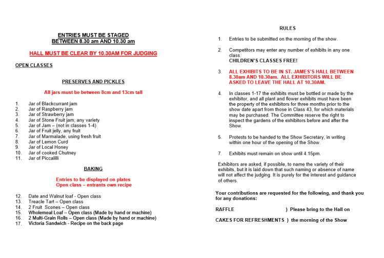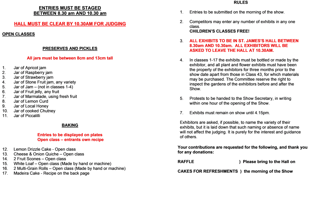 Summer Show St James Hall, Sat 3rd, 8.30am to 5.00p.m The Schedule for the Summer Show can be found in “2022 Gallery”