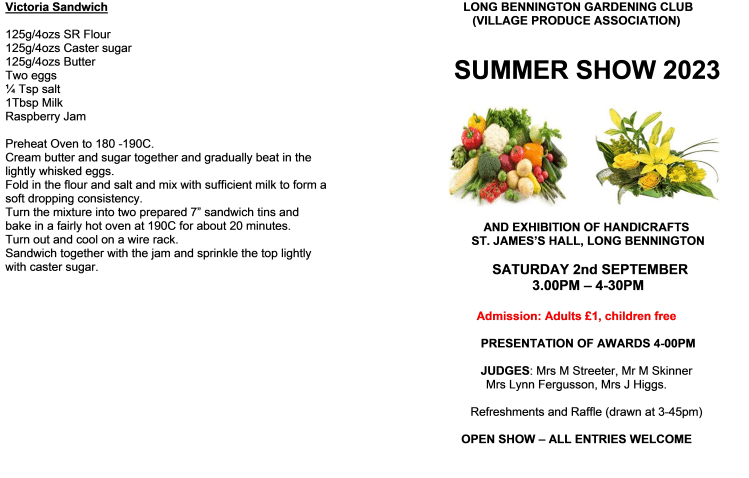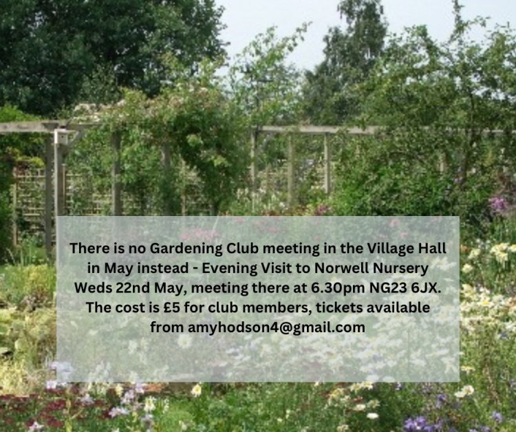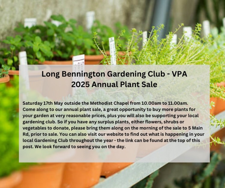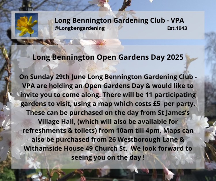 Open Gardens Long Bennington – Sun 19th, 10.00am to 4.00pm. St James Hall will be open for hot drinks & toilet facilities. There will be 13 gardens to visit, entrance leaflets cost £5 per family (£4 concession). The leaflet includes a description & a map of participating gardens – these can be purchased on the day from St James Village Hall. All are welcome, hope to see you on the day.