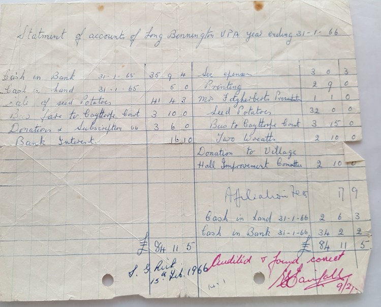 There was also the discovery, by a past Club secretary – Katherine Sheen of a cup. This cup is engraved “Presented By popular Gardening – 1955”. Popular Gardening was a publication, edited for over 40 yrs by H.H. Thomas, who in his day was a very well known horticulturist – he became the first regular gardening columnist on The Daily Telegraph, was awarded the RHS Medal of Honour & elected President of The Kew Guild. We contacted his grandson to try & find more about the publication Popular Gardening. His grandson suggested we contact David Marsh, a journalist, who has written articles on H.H Thomas. David provided us with the following information – “Popular Gardening” started out as “Gardener” and ran until 1920 when it changed names and became “Popular Gardening” until 1985 when it was taken over and absorbed into “Amateur Gardening”. VPAs originated in the second World War and were introduced to boost food production as part of the “Dig for Victory” campaign. Associations were set up countrywide and were co-operatives, enabling members to take advantage of bulk buying through the associations. This can be see in the picture below, which is a statement of accounts of the Long Bennington VPA, year ending 31-1-66. The fourth entry on the right shows “seed potatoes – £32 0s 0d.